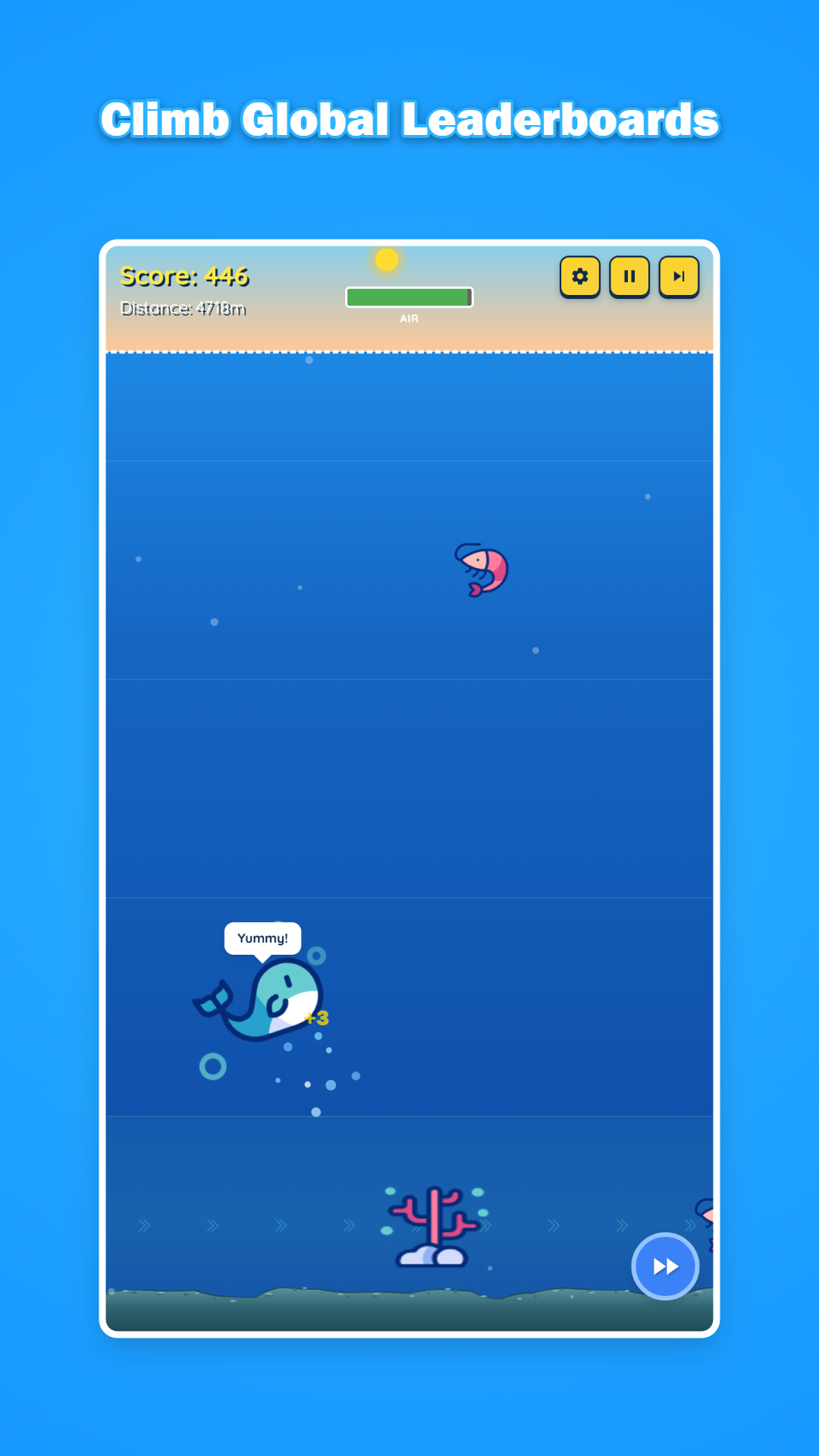 - Visuals that lean into color. Bright neon against deep blue, with particle trails behind the whale that stretch as you speed up. If you dislike saturated palettes, fair warning.